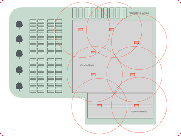 • Překrývající se „kruhy“ pokrytí zajišťují, že se hovor nepřeruší ani při pohybu mezi halou, skladem, kanceláří a venkovním prostorem.